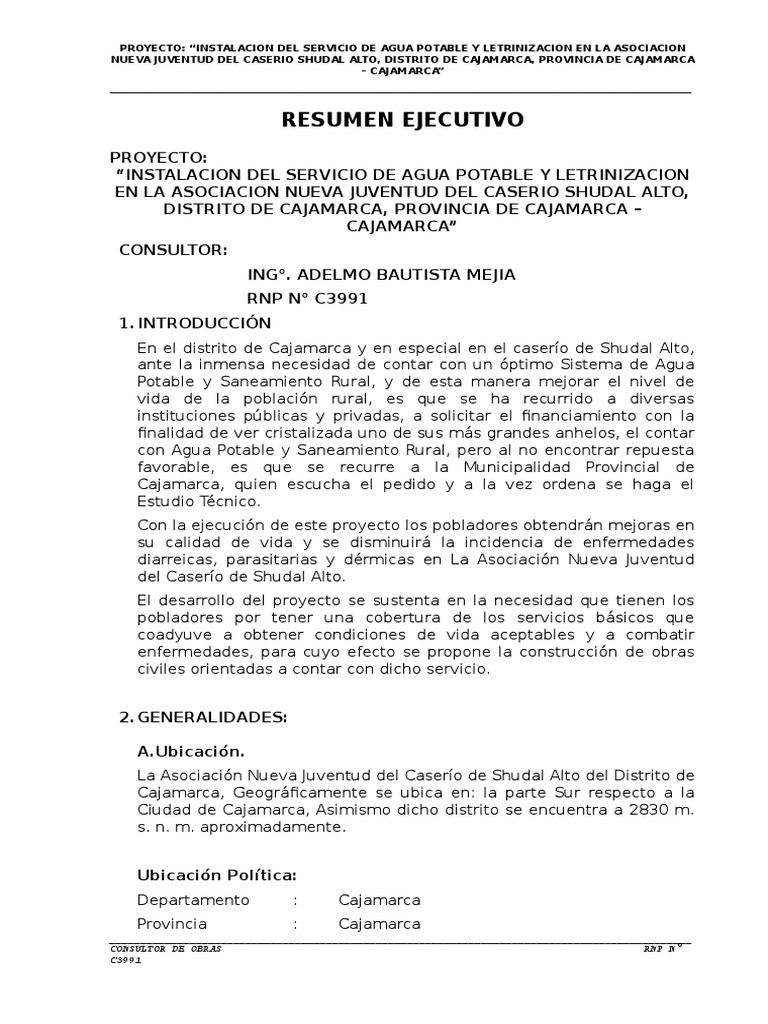 PROYECTO: “INSTALACION DEL SERVICIO DE AGUA POTABLE Y LETRINIZACION EN LA ASOCIACION