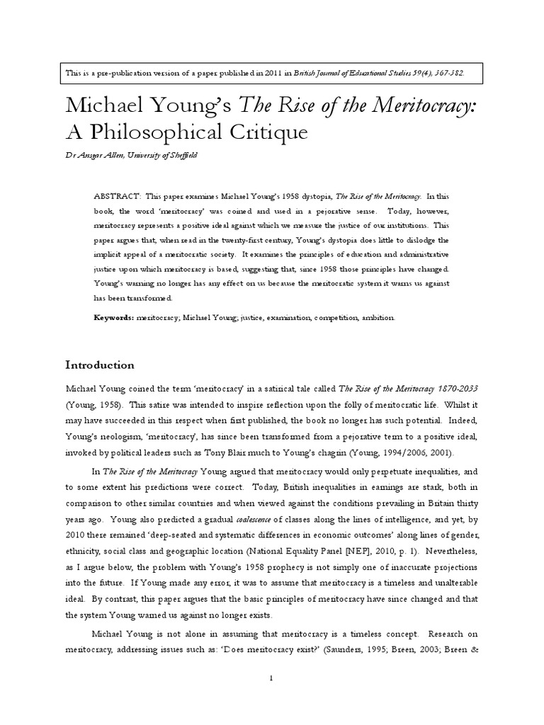 ABSTRACT: This paper examines Michael Youngs 1958 dystopia, The Rise of the Meritocracy. In this
