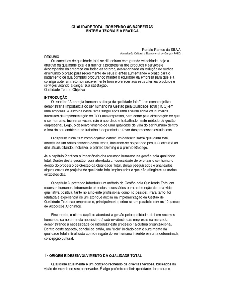 O captulo inicial tem como objetivo definir um conceito sobre qualidade total,