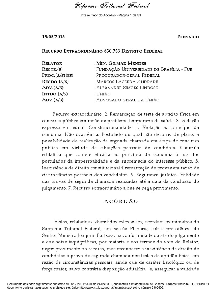 (S) : FUNDAÇÃO UNIVERSIDADE DE BRASÍLIA . e assegurou a validade das provas de segunda chamada realizadas até a data deste julgamento. vencido o Ministro Marco Aurélio que desprovia o recurso. da República. negou provimento ao recurso. por maioria e nos termos do voto do Relator.(A/S) : UNIÃO ADV.stf.(A/S) : ALEXANDRE SIMÕES LINDOSO INTDO.05. Dias Toffoli. Cármen Lúcia. o Ministro Celso de Mello.(A/S)(ES) : PROCURADOR-GERAL FEDERAL RECDO. mas com conseqüências diversas. justificadamente. : DISTRITO FEDERAL RELATOR : MIN. Ministro Joaquim Barbosa.15/05/2013 Inteiro Teor do Acórdão . em razão de circunstâncias pessoais. Falou pelo recorrido o Dr.FUB PROC. 15.asp sob o número 3858400 . Plenário. Luiz Fux. Alexandre Simões Lindoso. mas reconheceu a inexistência de direito de candidatos à prova de segunda chamada nos testes de aptidão física. Dra. Ricardo Lewandowski. Vice-Procuradora-Geral Duprat de Britto Pereira. Deborah Macedo p/ Luiz Tomimatsu Assessor-Chefe do Plenário Documento assinado digitalmente conforme MP n° 2. ainda que de caráter fisiológico ou de força maior.ICP-Brasil. Presentes à sessão os Senhores Ministros Marco Aurélio.733 PROCED. Gilmar Mendes. Votou o Presidente.(A/S) : MARCOS LACERDA ANDRADE ADV.2013. GILMAR MENDES RECTE.Supremo Tribunal Federal Extrato de Ata . que institui a Infra-estrutura de Chaves Públicas Brasileira . e quanto à aplicação do regime da repercussão geral ao caso. O documento pode ser acessado no endereço eletrônico http://www.Página 59 de 59 PLENÁRIO EXTRATO DE ATA RECURSO EXTRAORDINÁRIO 630. salvo contrária disposição editalícia. Rosa Weber e Teori Zavascki.br/portal/autenticacao/autenticarDocumento.(A/S) : ADVOGADO-GERAL DA UNIÃO Decisão: O Tribunal. Presidência do Senhor Ministro Joaquim Barbosa.jus.200-2/2001 de 24/08/2001. Ausente.