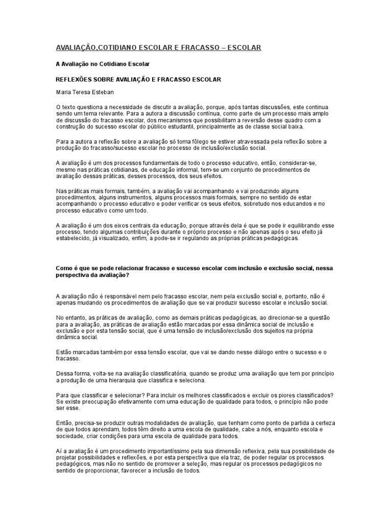 avaliao escolar, que no tem como objeto o processo de conhecimento." ( ESTEBAN, 2001, p. 110)