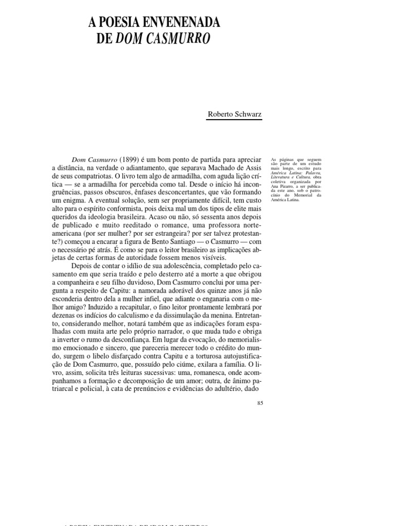 de seus compatriotas. O livro tem algo de armadilha, com aguda lição crí- tica — se a armadilha for percebida como tal. Desde o início há incon- gruências, passos obscuros, ênfases desconcertantes, que vão formando um enigma. A eventual solução, sem ser propriamente difícil, tem custo alto para o espírito conformista, pois deixa mal um dos tipos de elite mais queridos da ideologia brasileira. Acaso ou não, só sessenta anos depois de publicado e muito reeditado o romance, uma professora norte- americana (por ser mulher? por ser estrangeira? por ser talvez protestan- te?) começou a encarar a figura de Bento Santiago — o Casmurro — com