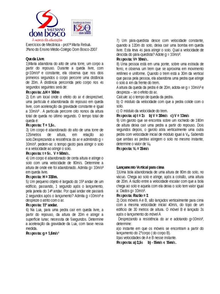 1)Uma bola abandonada de uma altura de 80m do solo, no