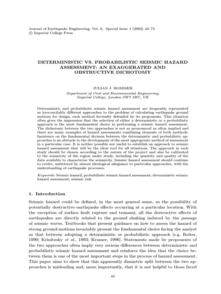 Frankel and Safak.D. narrow philosophy in stifling religious — and scientific — thought in later centuries are known only too well. Kiremidjian. Such arguments carry the danger of establishing orthodoxies. for example. with all their attendant perils and limitations. Nonetheless. Irenaeus of Lyons penned a multi-tome treatise entitled Adversus Haereses — Against Heresies. “Against orthodoxies”f How should the method for seismic hazard assessment be chosen? Reiter [1990] rightly argues that “the analysis must fit the needs”. It has in fact already become well recognised that there is not a mutually exclusive dichotomy between DSHA and PSHA. Bommer recurrence relationships [e.g. however. opening up the possibility of exploring combined methods. or which may be appropriate now and yet not be in a few years time as understanding of the earthquake process advances. probabilism is not a bivariate choice but a continuum in which both analyses are conducted. at a time when the early Christian church had gone beyond only having enemies outside its camp.March 15. and continues to do so [e. Reiter [1990] says that in many situations the choice “has been rephrased so that the issue is not “whether ” but rather “to what extent ” a particular approach should be used”. [1997]. St. McGuire [2001] asserts that “determinism vs. 2002].g. a mere two years after their publication. Jackson. What are the bases for the orthodoxies of PSHA and DSHA? For the PSHA church. have had to be revised not only numerically but also conceptually following the 1999 earthquakes in Turkey and Taiwan.. the cornerstone of its creed seems to be the overriding importance of the probability of exceedance of particular levels of ground motion. Hazard assessment should be chosen and adapted not only to the required output and objectives of the risk study of which it forms part. it should also be adapted to the characteristics of the area where it is being applied and the level and quality of the data available. interesting to note that both Reiter [1990] and McGuire [2001].2. but more emphasis is given to one over the other”. 2001]. The effects of such rigid insistence on a particular. It is. . 1999. The ability to locate and identify active geological faults in continental areas has also advanced by leaps and bounds over recent years. There is no need to establish standard approaches that may be well suited to some settings and not to others. J. Bommer et al. point towards deaggregation of PSHA as an important tool in hybrid approaches. leading to rapid evolution. 5.. Every major earthquake that is well recorded by accelerographs throws up new answers and poses new questions. The near-field directivity factors proposed by Somerville et al. despite the fact that teams of experts working with the same data can easily come up with answers f In the period 182 to 188 A. 2002 8:34 WSPC/124-JEE 62 00064 J. who make positive contributions to moving away from the dichotomy. a panacea for all situations. 1998. there is a tendency amongst many in the field of earthquake engineering who would argue for the superiority of one approach or the other as the “ideal”.