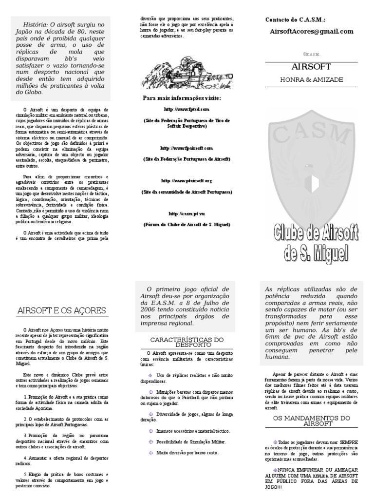 Este fascinante desporto foi introduzido na região através do esforço de um grupo de amigos que constituem actualmente o Clube de Airsoft de S. Diversidade de jogos.A. NUNCA EMPUNHAR OU AMEAÇAR ALGUÉM COM UMA RÉPLICA DE AIRSOFT EM PÚBLICO FORA DAS ÁREAS DE JOGO!!! .AIRSOFT E OS AÇORES O Airsoft nos Açores tem uma história muito recente apesar de já ter representação significativa em Portugal desde do novo milénio. As bb’s de 6mm de pvc de Airsoft estão comprovadas em como não conseguem penetrar pele humana. 2. alguns de longa duração. Possibilidade de Simulação Militar. Vários dos melhores filmes feitos até à data usaram réplicas de airsoft devido ao realismo e custo. Promoção da região no panorama desportivo nacional através de encontros com outros clubes e associações de airsoft. Aumentar a oferta regional de desportos radicais. 4. Apesar de parecer distante o Airsoft e suas ferramentas fazem já parte da nossa vida. CARACTERÍSTICAS DO DESPORTO O Airsoft apresenta-se como um desporto com essência militarista de características únicas: Uso de réplicas realistas e não muito dispendiosas. As réplicas utilizadas são de potência reduzida quando comparadas a armas reais. Munições baratas com disparos menos dolorosos do que o Paintball que não pintam ou sujam o jogador. Elogio da prática de bons costumes e valores através do comportamento em jogo e posterior convívio.M. outras protecções são opcionais mas aconselhadas. Promoção do Airsoft e a sua prática como forma de actividade física na camada adulta da sociedade Açoriana. 5. sendo inclusive prática comum equipas militares de elite treinarem com armas e equipamento de airsoft. Muita diversão por baixo custo. O estabelecimento de protocolos com as principais lojas de Airsoft Portuguesas. a 8 de Julho de 2006 tendo constituído noticia nos principais órgãos de imprensa regional. não sendo capazes de matar (ou ser transformadas para esse propósito) nem ferir seriamente um ser humano. Todos os jogadores devem usar SEMPRE os óculos de protecção durante a sua permanência no terreno de jogo. Miguel. OS MANDAMENTOS DO AIRSOFT Imensos acessórios e material táctico. 3. Este novo e dinâmico Clube prevê entre outras actividades a realização de jogos semanais e tem como principais objectivos: 1. O primeiro jogo oficial de Airsoft deu-se por organização da E.S.