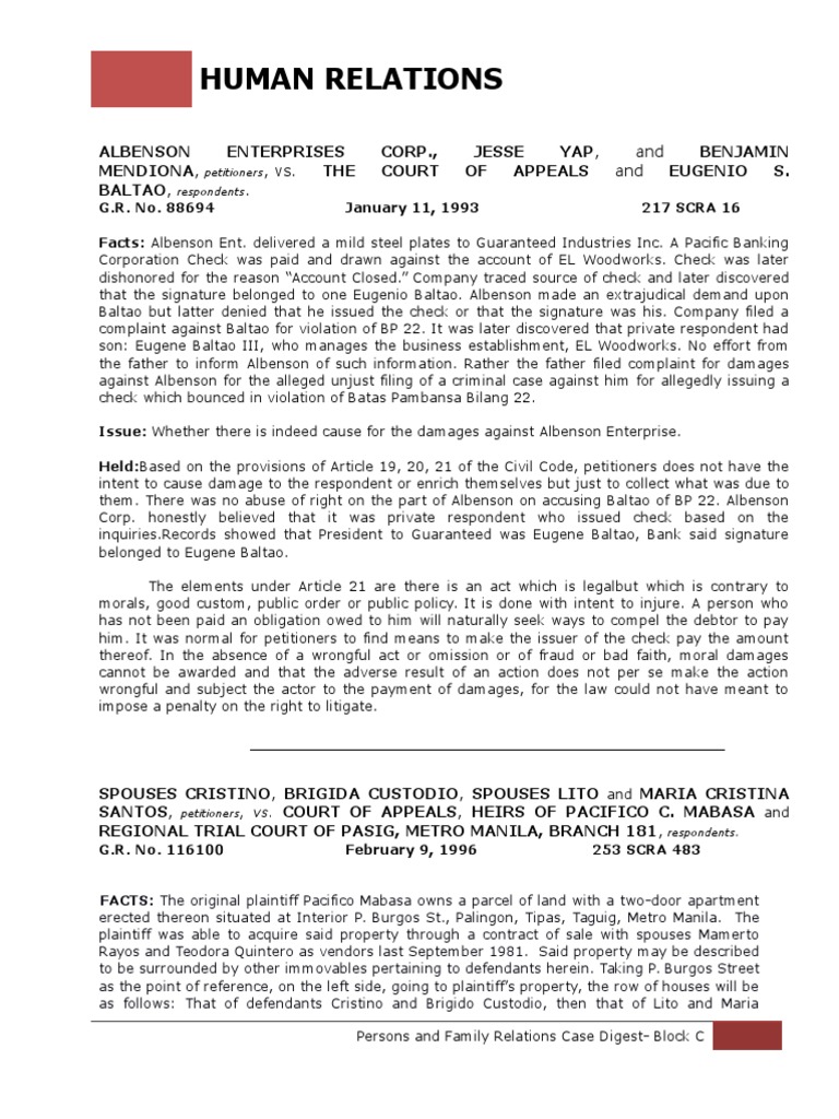 Block C .HUMAN RELATIONS Persons and Family Relations Case Digest.