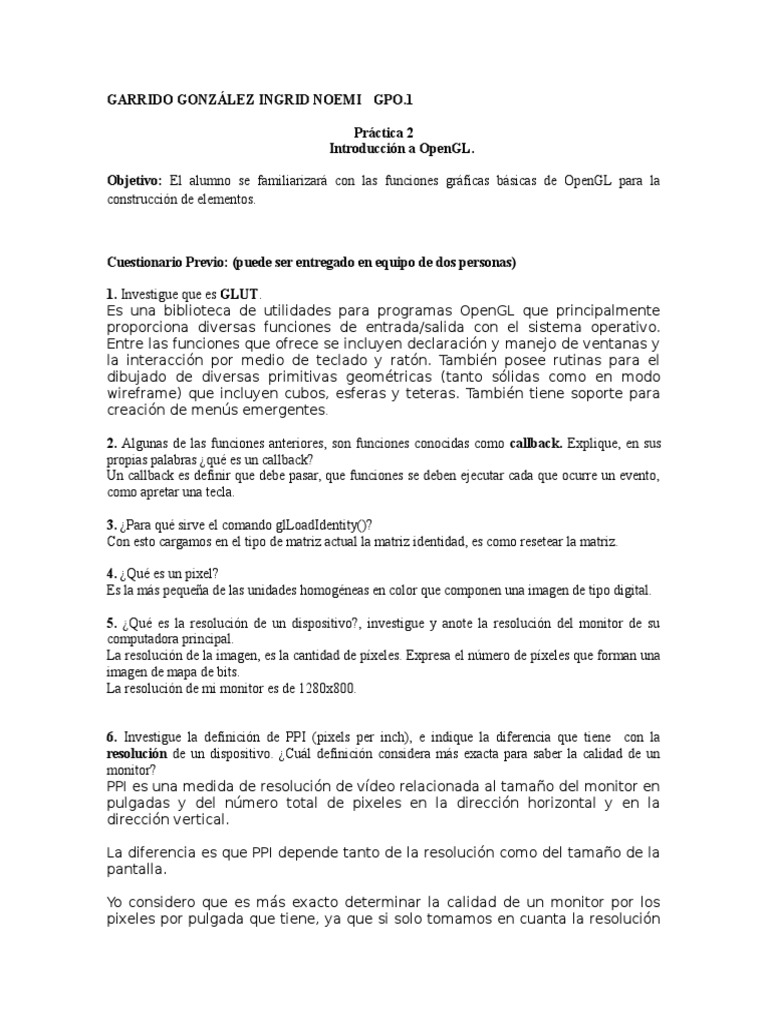 7.com/imagendigital/numeropixeles.google.de/pixel/ http://www.org/wiki/PPI Reporte Práctica 1. aunque creo que si no hubiéramos hecho primero esta práctica en el laboratorio no hubiera podido hacer que funcionara el código en la computadora de mi casa. De un breve comentario de la práctica pasada. Grupo teoría: 03 Correo: ingrid. Después de esos cambios ya se pudo ejecutar y ver que se proyectaba una tetera.wikipedia. Cree proyectos y realice los pasos de configuración del ambiente de desarrollo en equipos de cómputo diferentes al del laboratorio.wikipedia.org/wiki/GLUT http://pepao-7.dll en la carpeta C:\Users\Usuario\Documents\Visual Studio 2010\Projects\CG_2015\Debug ya que sin ella no podía depurar.digitalfotored. BIBLIOGRAFÍA http://es. ya que decía que rot no estaba definido. En base en ello conteste: a) ¿Pudo conseguir que el código de muestra funcione? Si b) Liste los problemas que tuvo o intentó resolver para hacer funcionar el código.garrido13@gmail. Es importante saber las funciones y conceptos básicos de GLUT así como de los elementos que componen a una imagen para su creación posterior. Primero tuve que pegar la librería glut32.com/presentation/d/1LyBTh_nYuzgfePCArH3l2miXo50GFo-XWeSSf840RA/mobilepresent?slide=id. Anote el número de grupo de la materia Computación Gráfica (Teoría) y su dirección de correo electrónico.com/2012/09/10/pantallas-que-son-el-tamano-laresolucion-y-la-densidad-de-pixeles/ http://es. indicando los pasos que se le complicaron y sugerencias para mejorar desarrollo de la práctica. ya que desconozco totalmente Visual Studio.com CONCLUSIÓN GLUT es parte fundamental de OpenGL para poder crear y facilitarnos la creación y uso de objetos.mx/2007/03/previo1labcompgrafica.html?m=1 https://docs.i127 http://definicion. 2.blogspot. La práctica me pareció un buen inicio para conocer el mundo de Visual Studio así como de OpenGL y GLUT. (Individuales) 1. .htm http://androidayuda.de un dispositivo la calidad de una imagen se puede ver afectada al variar el tamaño de la pantalla. Segundo. tuve que comentar la linea: rot += 10.
