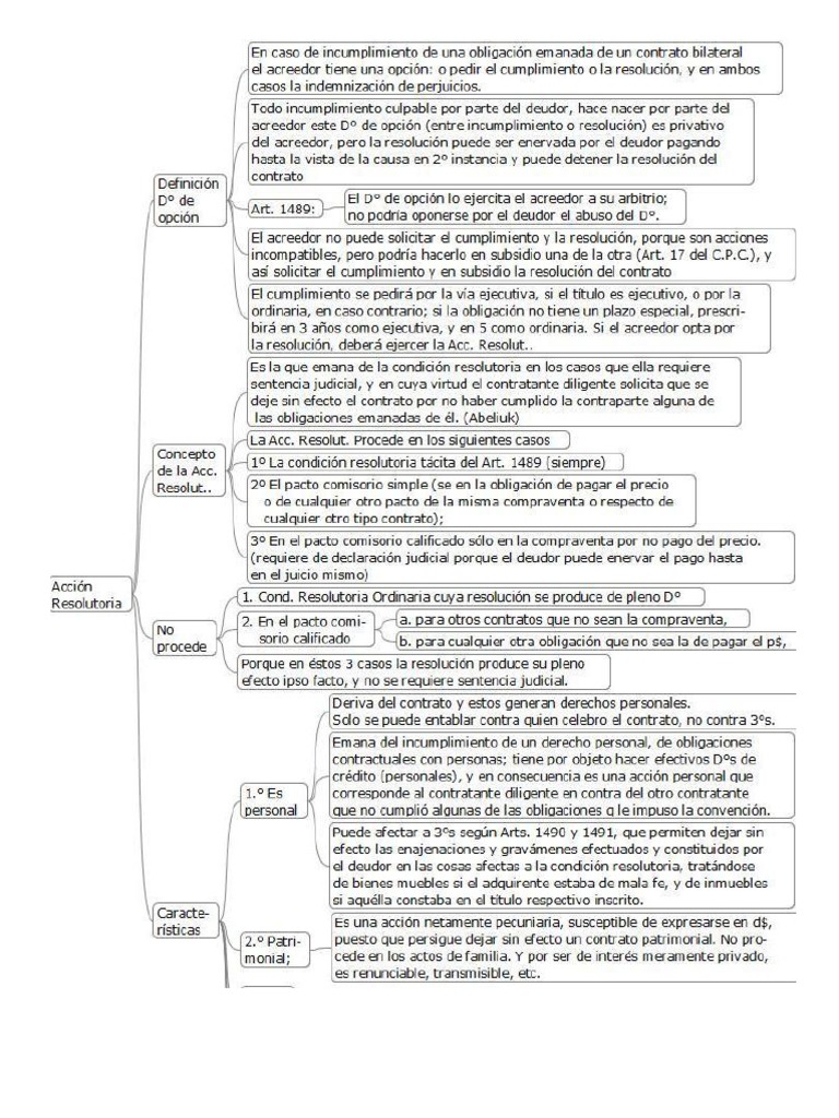 y en principio carece de efecto retroactivo. se entiende que nunca se celebró y las partes vuelven al E° anterior a la celebración del acto o contrato. Los frutos no se devuelven. consienten en darla por nula” Consiste en que las partes. el que permite al acreedor solicitar que se deje sin efecto el contrato En ambas se producen efectos radicales pero aquí son más atenuados porque se produce en ciertos casos. Y en la resolución Es requisito de ella el incumplimiento imputable La nulidad y rescisión producen efectos radicales. N. y no se pagan las mejoras necesarias. 2°2. el incumplimiento de una obligación. El acto es perfectamente válido.1 Nuldad (absoluta) y rescisión (relativa) Resciliación (1567) Rescisión: Suponen alguna infracción a los requisitos de validez del acto o contrato. por RG. por el incumplimiento de una de las partes de una obligación del contrato. Véase Alessandri. consiste en la privación de la existencia de un contrato (hacerlo desaparecer a los ojos del d°).° 1. 241.689 da acción contra 3°s inmediatamente.. La acción de nulidad absoluta prescribe en 10 años. Se trata de un acto con vicio de validez. sec. “Toda obligación puede extinguirse por una convención en que las partes interesadas. y por ello se le deja sin efecto. 79. Resolución Efectos Tipos Prescripción Prestaciones mutuas 1 Es el efecto de la acción resolutoria.635. T. pág. en esto se diferencia de la nulidad. la rescisoria en 4. borran totalmente el acto o contrato. De la compraventa. y de la resolución en que ésta procede por sentencia judicial. 1. 2°. pero puede demandarse la resolución en subsidio de la rescisión: RDJ. para accionar contra 3°s tienen que cumplirse ciertas condiciones (1490 y 1491) Procede únicamente en contratos bilaterales Por RG la acción resolutoria en 5 años que pueden ser 4 en el pacto comisorio. sec. T. y a petición de una de las partes En la resciliación basta el acuerdo de las partes. . pág. la-. RDJ. en sí mismo es un hecho posterior. En la nulidad y rescisión el deudor de mala fe debe restituir los frutos. La resciliación no puede afectar a los 3°s ajenos al acto. 19. Es un efecto jurídico emanado del ejercicio de la acción resolutoria. ese contrato es rescindible para cualquiera que sea el poseedor de la cosa. a menos que las partes se lo confieran. siendo capaces de disponer libremente de lo suyo. pág. La resolución cuando hay un incumplimiento...Paralelo de la Acción Resolutoria con otras acciones. la nulidad de acuerdo al Art. 498. T. 46. Si fue celebrado por un incapaz. dejan sin efecto un contrato que en sí es perfectamente válido. La nulidad procede en toda clase de actos y contratos. Por ello se ha resuelto que no procede declarar resuelto un contrato si él es nulo. que ha nacido viciado. de común acuerdo.