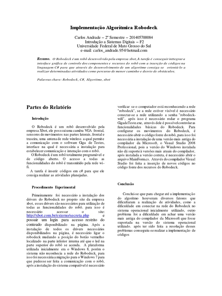 Palavras chave: Robodeck, C#, Algoritmo, xbot