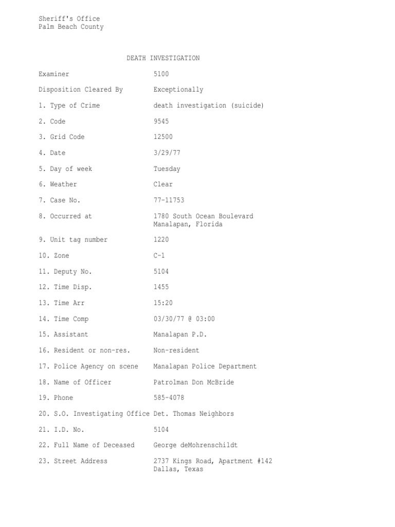 Sheriff's OfficePalm Beach County DEATH INVESTIGATIONExaminer 5100Disposition Cleared By Exceptionally1. Type of Crime death investigation (suicide)2. Code 95453. Grid Code 125004. Date 3/29/775. Day of week Tuesday6. Weather Clear7. Case No. 77-117538. Occurred at 1780 South Ocean Boulevard Manalapan, Florida9. Unit tag number 122010. Zone C-111. Deputy No. 510412. Time Disp. 145513. Time Arr 15:2014. Time Comp 03/30/77 @ 03:0015. Assistant Manalapan P.D.16. Resident or non-res. Non-resident17. Police Agency on scene Manalapan Police Department18. Name of Officer Patrolman Don McBride19. Phone 585-407820. S.O. Investigating Office Det. Thomas Neighbors21. I.D. No. 510422. Full Name of Deceased George deMohrenschildt23. Street Address 2737 Kings Road, Apartment #142 Dallas, Texas