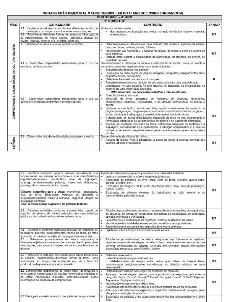 ORGANIZAÇÃO BIMESTRAL MATRIZ CURRICULAR DO 4º ANO DO ENSINO FUNDAMENTAL