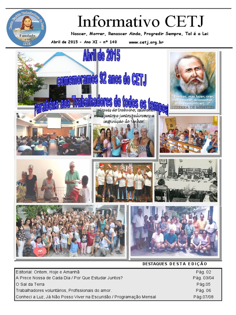 Portanto, o trabalhador incansvel prossegue atravs de novos irmos que chegam, sedentos de paz e esperana, e o melhor que ns podemos deixar para as geraes que nos sucedero, ajudando a escrever a continua e infinita histria do Centro Esprita Trabalhadores de
