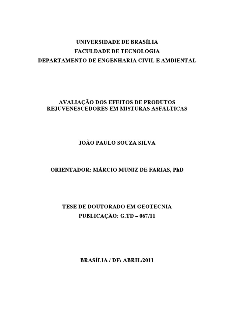 Ao Laboratório CENPES/Petrobrás aqui representado pela tão prestativa Leni Figueiredo Mathias Leite. Foi uma excelente e gratificante experiência de vida. A Betunel Tecnologia em Asfaltos por ter fornecido os agentes rejuvenescedores e que gentilmente realizou os ensaios de DSR apresentados nesta pesquisa. que gentilmente realizou os ensaios químicos desta pesquisa. vi . Ao apoio financeiro fomentado pelo Conselho Nacional de Desenvolvimento Científico e Tecnológico – CNPq.
