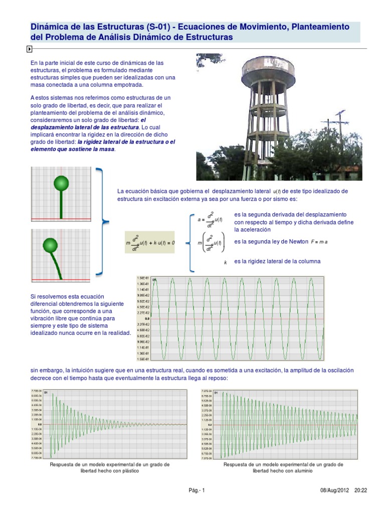.. El coeficiente de amortiguamiento equivalente es especificado de modo tal que la energía que disipa es equivalente a la energía disipada por todos lo mecanismos presentes en un momento dado. Fuerza de Amortiguamiento El proceso por el cual la amplitud de la vibración disminuye de manera sostenida en el tiempo. Fricción entre los elementos no estructurales.5 fD fS = p ( t) 2 Aceleración: d u 2 dx 08/Aug/2012 20:22 . . Es un hecho que en el estado actual de conocimientos resulta casi imposible modelar matemáticamente todos lo mecanismo de disipación de energía de vibración involucrados.. Con el amortiguamiento.Y mucho otros más mecanismos pueden estar presentes. Las unidades de la masa son fuerza/aceleración k u ( t) = p ( t ) Velocidad: d u dx Pág. entre ellos tenemos lo siguientes: Disipación de energía por calor debido a cargas y descargas cíclicas de los elementos estructurales y por fricción interna por deformación Fricción entre las conexiones de los elementos. es llamada amortiguamiento.. Por esa razón actualmente el amortiguamiento se modela de forma muy simplificada por amortiguadores viscosos o amortiguadores de aire. Apertura y cierre de microgrietas en el concreto. la energía de vibración de un sistema es disipada por uno o varios mecanismos que pueden actuar al mismo tiempo.. d u ( t) d x f d = c Ecuación de Movimiento: Fuerzas Externa 2 d u ( t) 2 dx fD fS = 0 2 d m u ( t) 2 dx d c u ( t ) d x p ( t) m Segunda ley de Newton: de acuerdo a los diagramas de cuerpo libre: Desplazamiento: u m 2 d u ( t) 2 dx Esta ecuación gobierna la deformación o desplazamiento de una estructura elástica lineal sujeta a una fuerza dinámica externa.