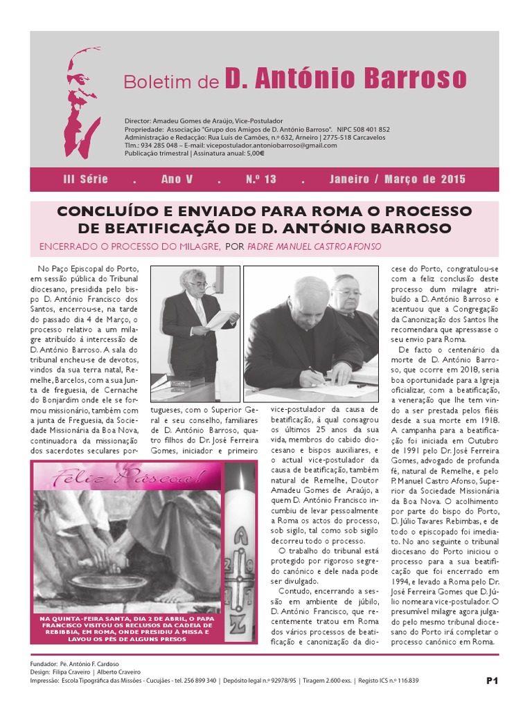 D. Antnio, ao Senhor Jesus Cristo, nico Senhor. At sempre. Padre Jos Adlio Macedo // Em 13-03-2015: Monsenhor Cnego Dr. ngelo Aves registou: Acompanhei ontem a entrega pelo vice-postulador Dr. Amadeu Arajo, na Congregao para as