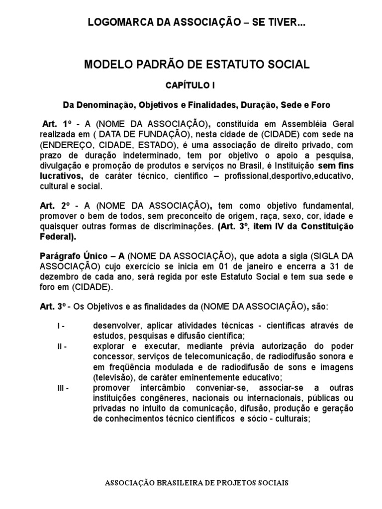 Art. 3 - Os Objetivos e as finalidades da (NOME DA ASSOCIAO), so: