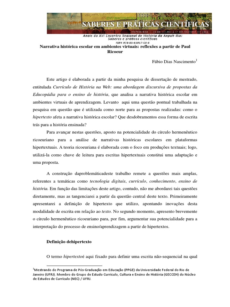lógica, ainda que não exijam uma leitura linear. Neles se constroem intrigas que relacionam seus textos – e os elementos presentes nesses – de acordo com referenciais teóricos e paradigmas selecionados na organização. Não é porque um aluno pode ir e vir em segmentos de um livro didático que ele é hipertextual. Essa característica narrativa é muito mais antiga do que o hipertexto. Para efeito de comparação com os exemplos acima, um sítio construído com a dinâmica hipertextual tem menor limitação material, pois confere maior facilidade de criação de links com um sem-número de textos. A lógica colaborativa da Rede faz com que esse material seja crescente e dinâmico, como se pode ver nas wikis, por exemplo. Indo além, as ferramentas de pesquisas disponíveis na Internet abrem o leque de possíveis caminhos de leituras, por diversos sítios, sem a necessidade de uma articulação lógica. Não existe um paradigma que rege a Internet, uma vez que ela é colaborativa, pouco regulada e, embora muitos conteúdos não estejam disponibilizados na Rede e outros o estejam de forma seletiva, a quantidade de conteúdo acessível e de relações possíveis é, em um termo prático, infinita. A partir daargumentação apresentada,defendo que elas e as ferramentas de produção intelectual, por elas disponibilizadas, não podem ser consideradas apenas um aparato didático-instrumental para a pedagogia. Acredito ser necessário que se repense o currículo e o papel dos professores a partir de reflexõesfocadas nas especificidades desses processos de produção e interação com o conhecimento mediados por novas tecnologias. Dentro dessa perspectiva, aposto na teoria hermenêutica ricoeuriana como chave de leitura potente para análise da narrativa histórica escolar hipertextual.