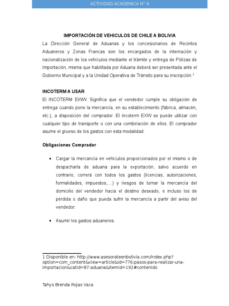6 Disponible en: http://www. 10% Valor CIF.C.V. etc. G. Seguros 037 .10% Valor FOB. marca.A. Agencias Despachante 2 – 0. I.ACTIVIDAD ACADEMICA N° 9 Detalle Porcentaje Flete Carretero 1.23 – 2.2% Valor FOB. Verificadora 1.com/index. 14.php? option=com_content&view=article&id=776:pasos-para-realizar-unaimportacion&catid=87:aduana&Itemid=192#contenido Tahys Brenda Rojas Vaca .94% Formula6 *Los costos de importación varían según el modelo de vehículo. cilindradas.A.5% Valor CIF. Almacenaje Según Tarifario.asesorateenbolivia.75% Valor FOB.