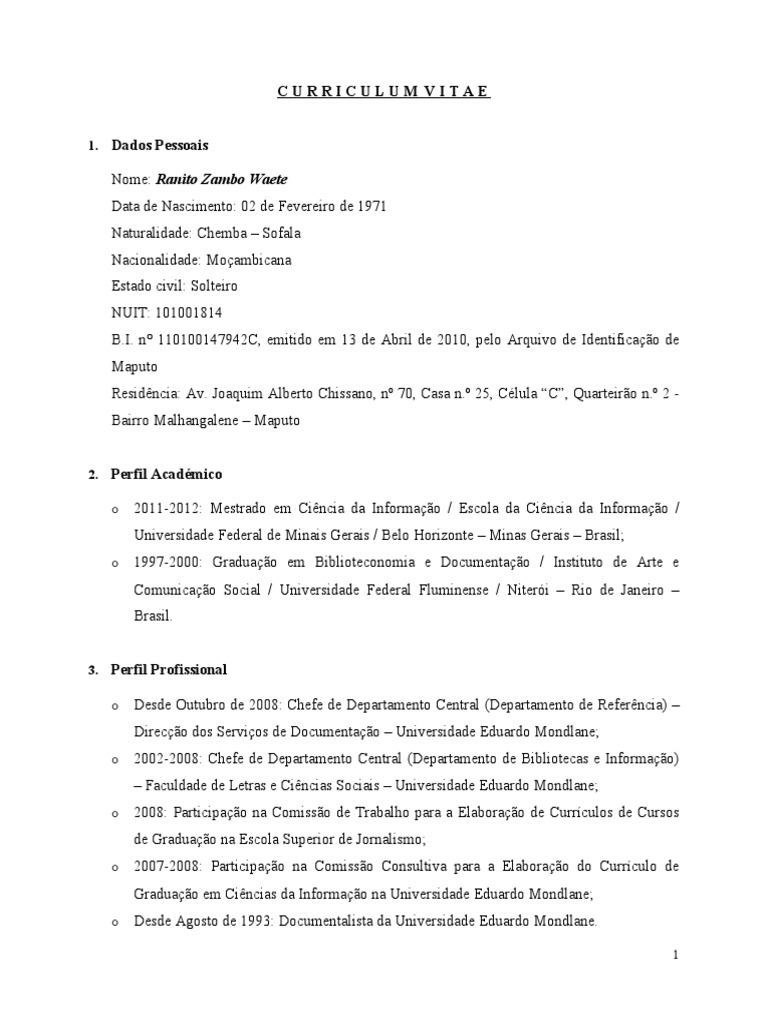 Nome: Ranito Zambo Waete Data de Nascimento: 02 de Fevereiro de 1971 Naturalidade: Chemba – Sofala Nacionalidade: Moçambicana Estado civil: Solteiro NUIT: 101001814 B.I. n° 110100147942C, emitido em 13 de Abril de 2010, pelo Arquivo de Identificação de Maputo Residência: Av. Joaquim Alberto Chissano, nº 70, Casa n.º 25, Célula “C”, Quarteirão n.º 2 - Bairro Malhangalene – Maputo