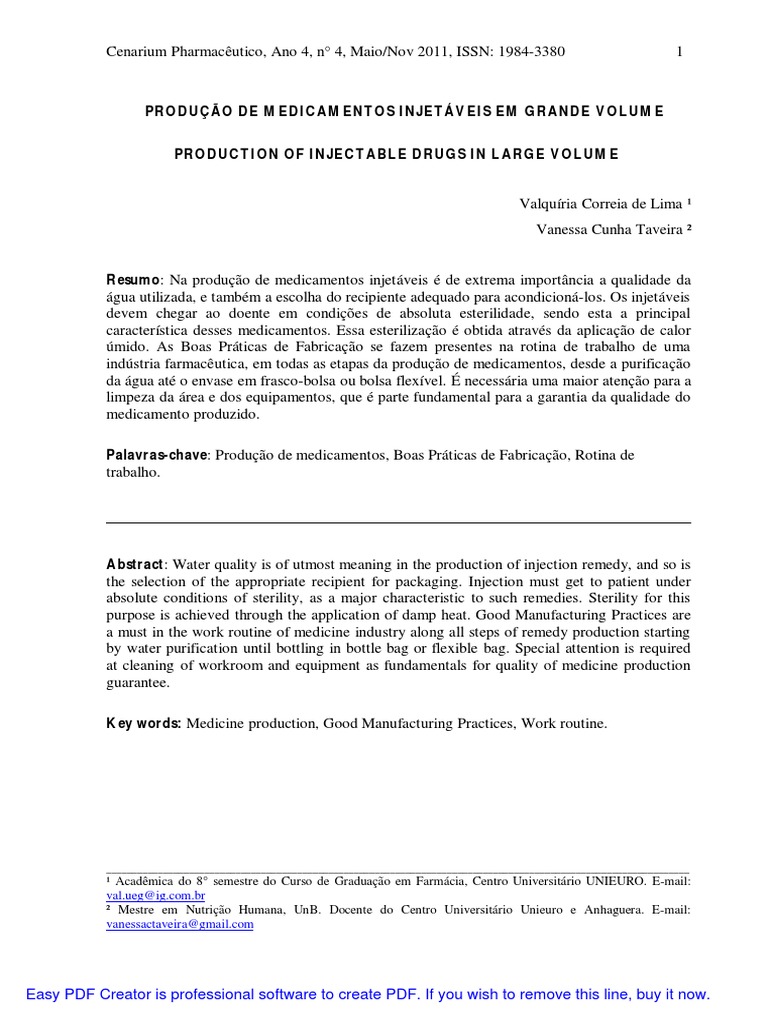Resumo: Na produo de medicamentos injetveis de extrema importncia a qualidade da