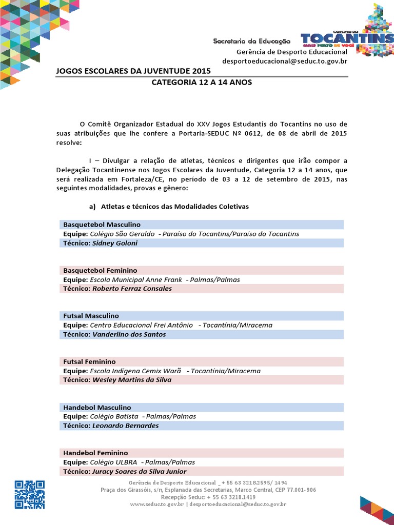 I – Divulgar a relação de atletas, técnicos e dirigentes que irão compor a Delegação Tocantinense nos Jogos Escolares da Juventude, Categoria 12 a 14 anos, que será realizada em Fortaleza/CE, no período de 03 a 12 de setembro de 2015, nas seguintes modalidades, provas e gênero:
