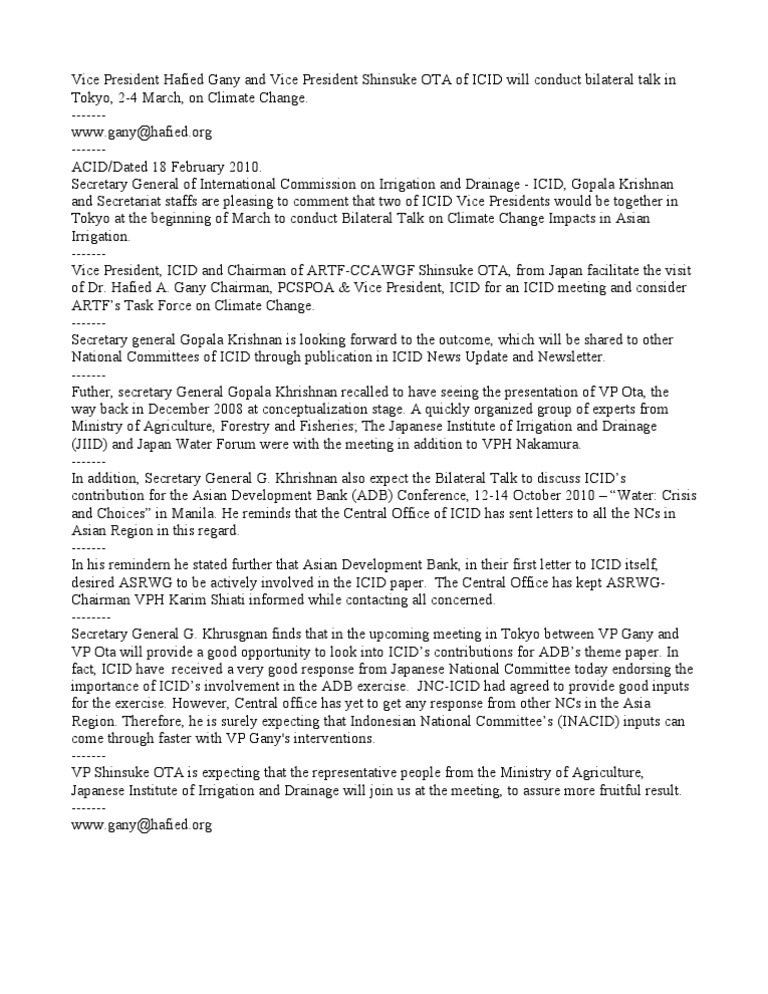 Vice President Hafied Gany and Vice President Shinsuke OTA of ICID will conduct bilateral talk in