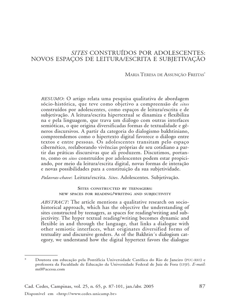 the sites constructed by teenagers can be propitiating through digital reading/writing, new ways of interaction and new possibilities for