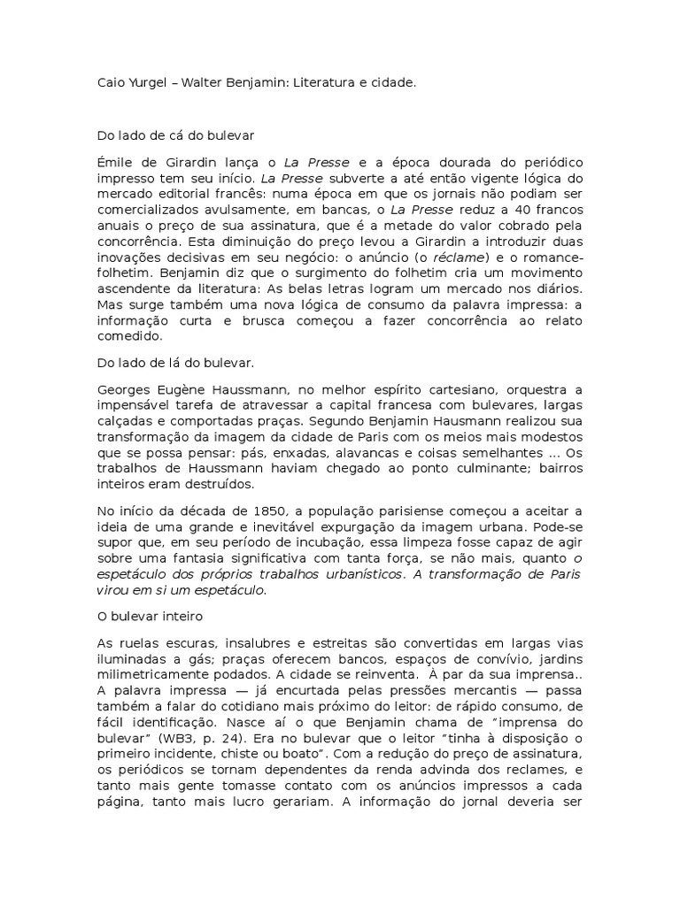 inovaes decisivas em seu negcio: o anncio (o rclame) e o romancefolhetim. Benjamin diz que o surgimento do folhetim cria um movimento