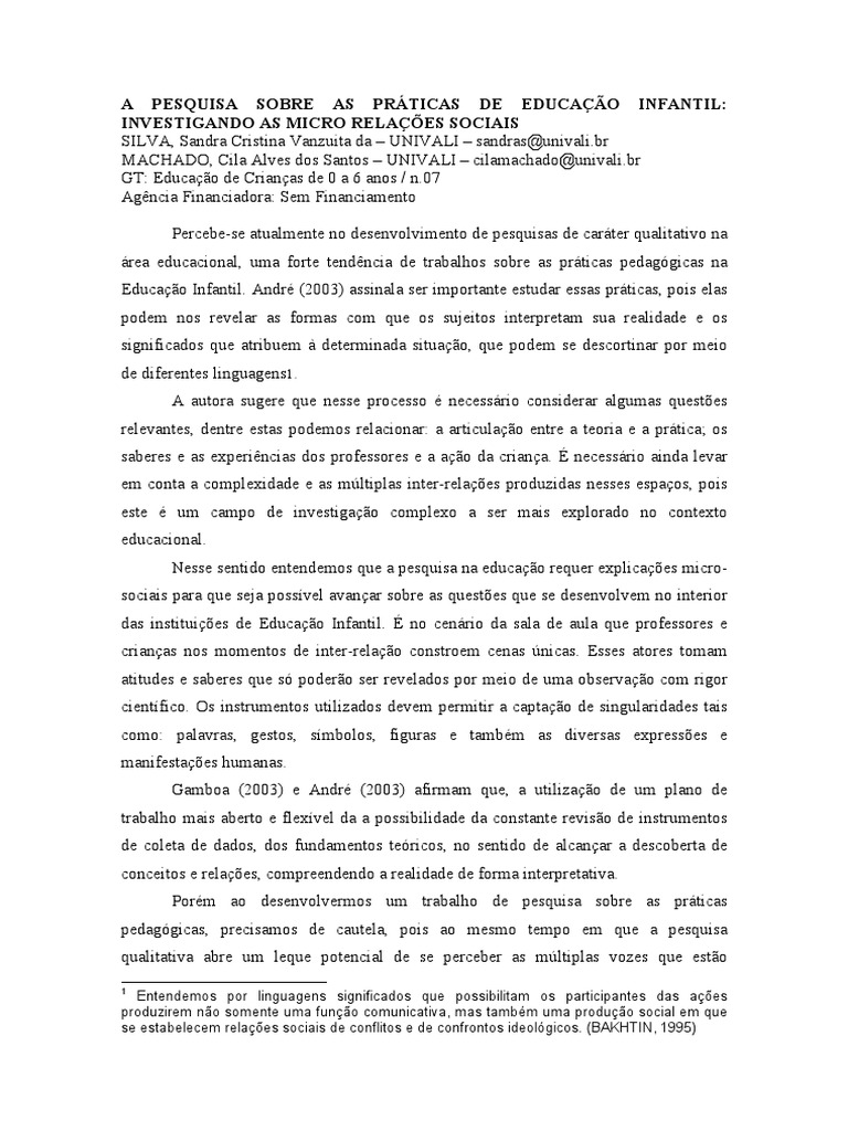 Educação Infantil. André (2003) assinala ser importante estudar essas práticas, pois elas