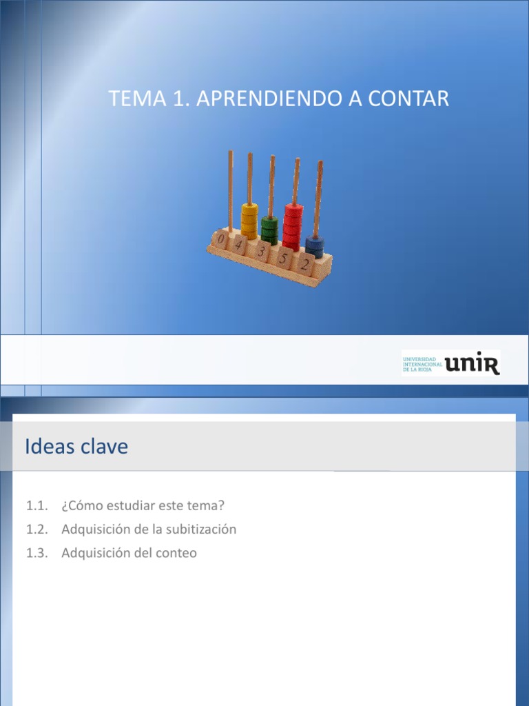 Nos basaremos en los cinco principios que componen el modelo de contar. Estudiaremos los conceptos de subitización y conteo y el proceso mediante el cual se 1 lograr la adquisición de ambos. ¿Cómo estudiar este tema? Para estudiar este tema lee el capítulo 1 (páginas 15–32) del manual de la asignatura: Cómo enseñar matemáticas para aprender mejor.1. como para desarrollar los cinco niveles evolutivos de comprensión de los numerales. tanto para analizar los errores típicos del conteo. . de Vicente Bermejo (Coord.1.).