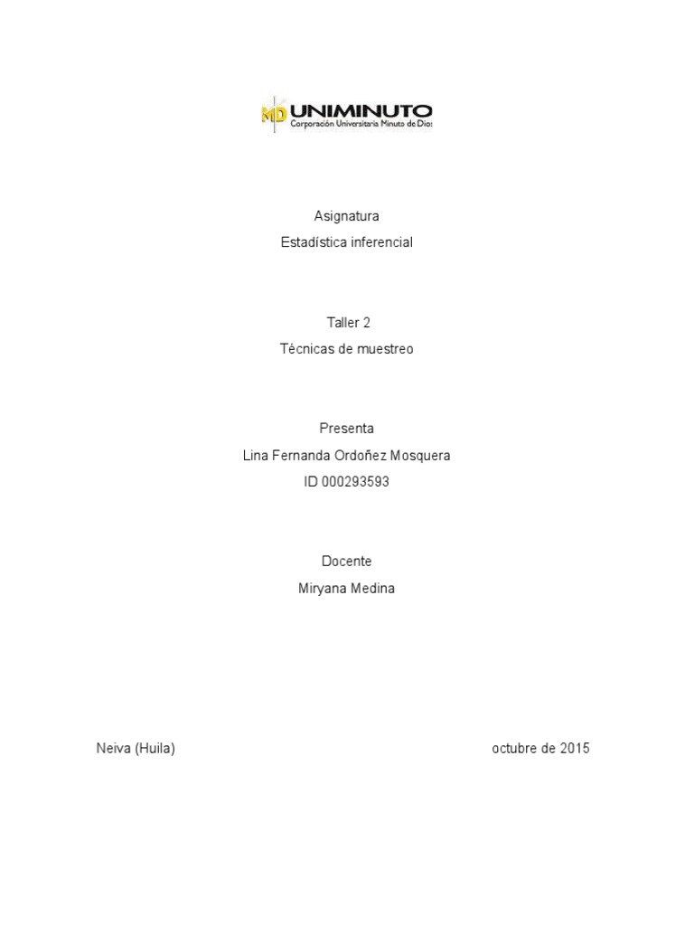 es obtenida con el fin de investigar. La muestra aleatoria puede no ser representativa del universo o población de la que se extrajo. es un conjunto de elementos que presentan una característica común. a partir del conocimiento de sus características particulares. no está basado en el cálculo de las probabilidades. (f) 2 Determinar en los ejercicios que se dan a continuación. Población: estudiantes matriculados en nuestra universidad. Rta: probabilístico muestreo aleatorio sistematico b. estratificado. es el de mayor control de la integridad y calidad de la enumeración (v) g. que para la tabulación y análisis. Una de las ventajas del muestreo. El método de selección al azar. la clase de muestra (probabilística o no probabilística) y el método (aleatorio simple. Población estadística. . No es necesario utilizar la misma unidad de selección para la aplicación del muestreo.1 Decir si es cierto o falso a los siguientes puntos: a. a. La muestra. en forma ordenada. (F) d. Técnica de muestreo: seleccionar un nombre por cada cincuenta. por conglomerados o sistemático). Técnica de muestreo: ir a la cafetería de la universidad y seleccionar un estudiante cada tercera mesa y entrevistarlo. selecciona uno. Población: listado de nombres que aparecen en el directorio telefónico. (v) f. en el presente semestre. (v) c. (v) b. Una población finita es aquella que está formada por un limitado número de elementos que presentan una característica (cualitativa o cuantitativa) en común. (F) e. o por cada tercer estudiante. las propiedades de toda la población.