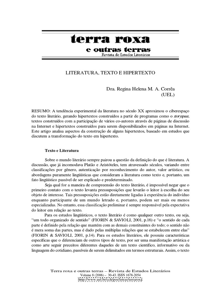 Regina Helena M. A. Corrêa Literatura, Texto e Hipertexto