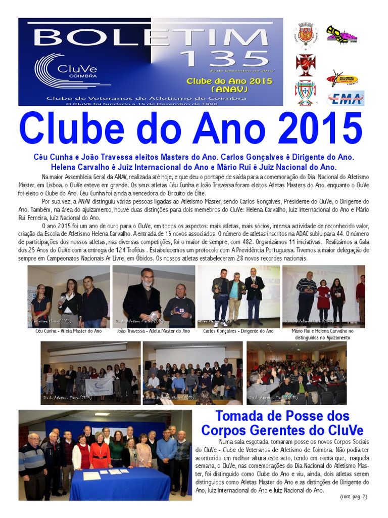 Numa sala esgotada, tomaram posse os novos Corpos Sociais do CluVe - Clube de Veteranos de Atletismo de Coimbra. Não podia ter acontecido em melhor altura este acto, tendo em conta que, naquela semana, o CluVe, nas comemorações do Dia Nacional do Atletismo Mas- ter, foi distinguido como Clube do Ano e viu, ainda, dois atletas serem distinguidos como Atletas Master do Ano e as distinções de Dirigente do Ano, Juiz Internacional do Ano e Juiz Nacional do Ano.