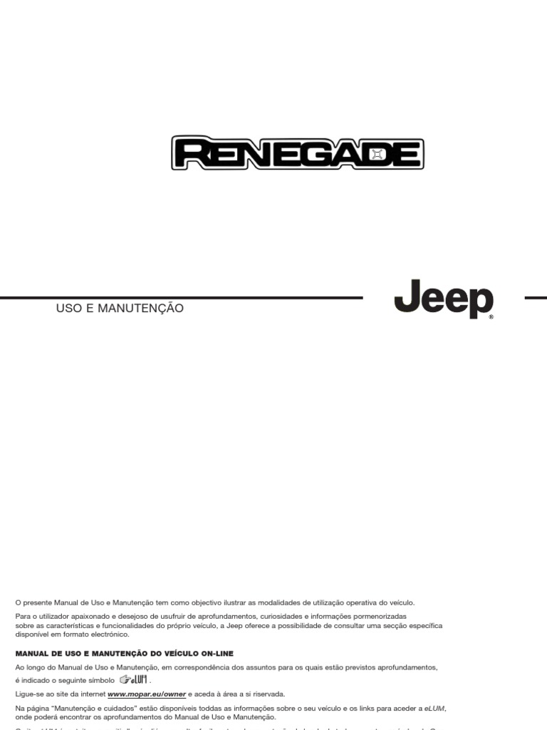 Neste Manual de Uso e Manuteno esto descritas todas as verses do Jeep Renegade. Contedos opcionais,