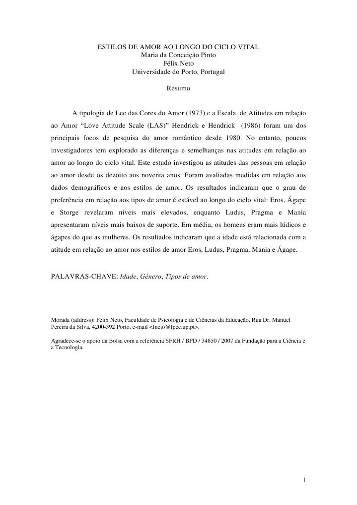 Neto, F., e Pinto, M. C. (2007). Love styles: A cross-cultural study of British, Indian, and Portuguese