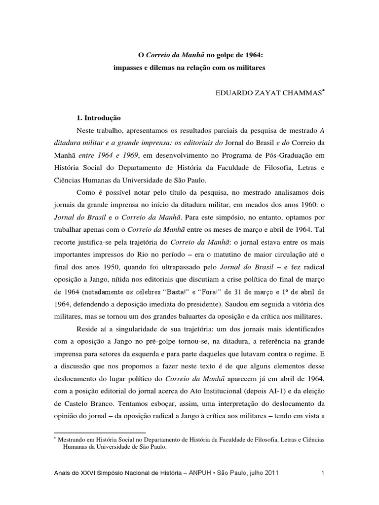 1. Introdução Neste trabalho, apresentamos os resultados parciais da pesquisa de mestrado A ditadura militar e a grande imprensa: os editoriais do Jornal do Brasil e do Correio da Manhã entre 1964 e 1969, em desenvolvimento no Programa de Pós-Graduação em História Social do Departamento de História da Faculdade de Filosofia, Letras e Ciências Humanas da Universidade de São Paulo. Como é possível notar pelo título da pesquisa, no mestrado analisamos dois jornais da grande imprensa no início da ditadura militar, em meados dos anos 1960: o Jornal do Brasil e o Correio da Manhã. Para este simpósio, no entanto, optamos por trabalhar apenas com o Correio da Manhã entre os meses de março e abril de 1964. Tal recorte justifica-se pela trajetória do Correio da Manhã: o jornal estava entre os mais importantes impressos do Rio no período – era o matutino de maior circulação até o final dos anos 1950, quando foi ultrapassado pelo Jornal do Brasil – e fez radical oposição a Jango, nítida nos editoriais que discutiam a crise política do final de março de 1964 (notadamente os célebres “Basta!” e “Fora!” de 31 de março e 1º de abril de 1964, defendendo a deposição imediata do presidente). Saudou em seguida a vitória dos militares, mas se tornou um dos grandes baluartes da oposição e da crítica aos militares. Reside aí a singularidade de sua trajetória: um dos jornais mais identificados com a oposição a Jango no pré-golpe tornou-se, na ditadura, a referência na grande imprensa para setores da esquerda e para parte daqueles que lutavam contra o regime. E a discussão que nos propomos a fazer neste texto é de que alguns elementos desse deslocamento do lugar político do Correio da Manhã aparecem já em abril de 1964, com a posição editorial do jornal acerca do Ato Institucional (depois AI-1) e da eleição de Castelo Branco. Tentamos esboçar, assim, uma interpretação do deslocamento da opinião do jornal – da oposição radical a Jango à crítica aos militares – tendo em vista a