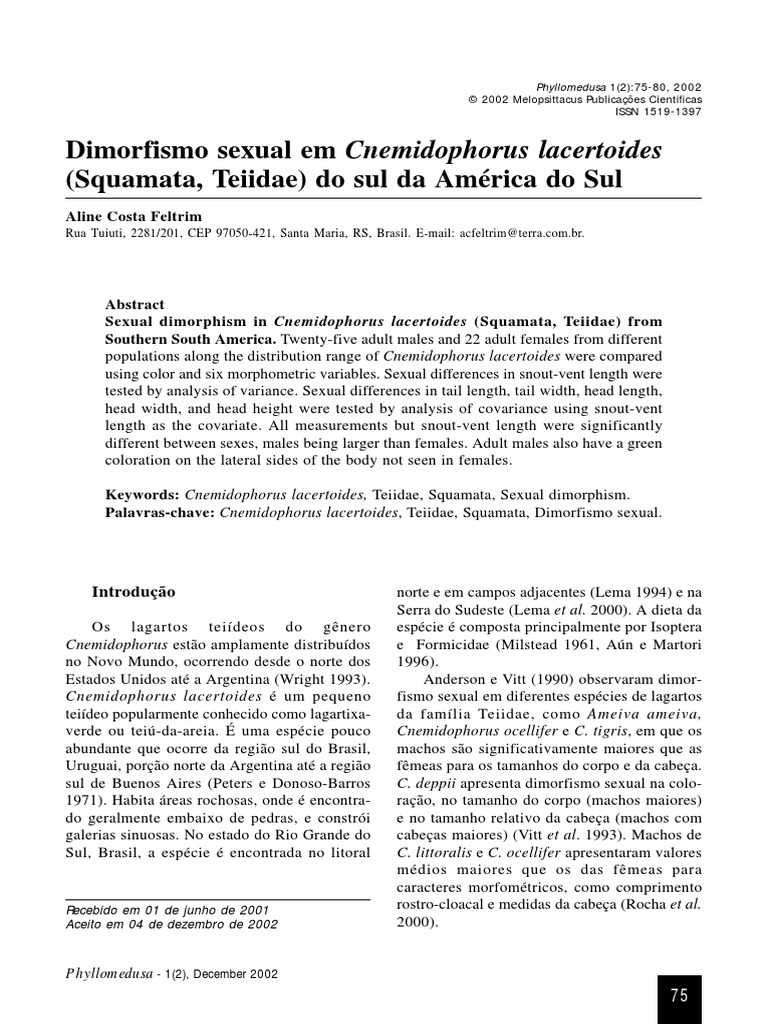 Palavras-chave: Cnemidophorus lacertoides, Teiidae, Squamata, Dimorfismo sexual.
