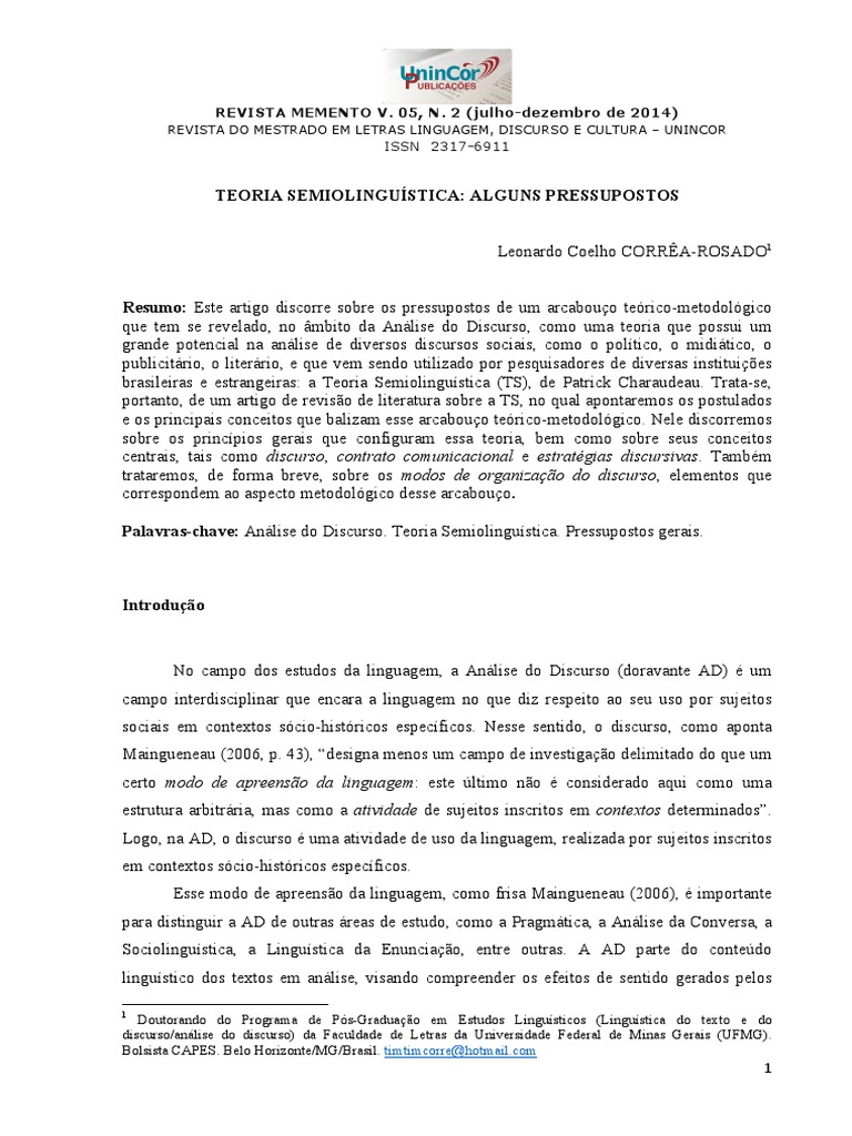Keywords: Discourse Analysis. Semiolinguistics Theory. General Assumptions.