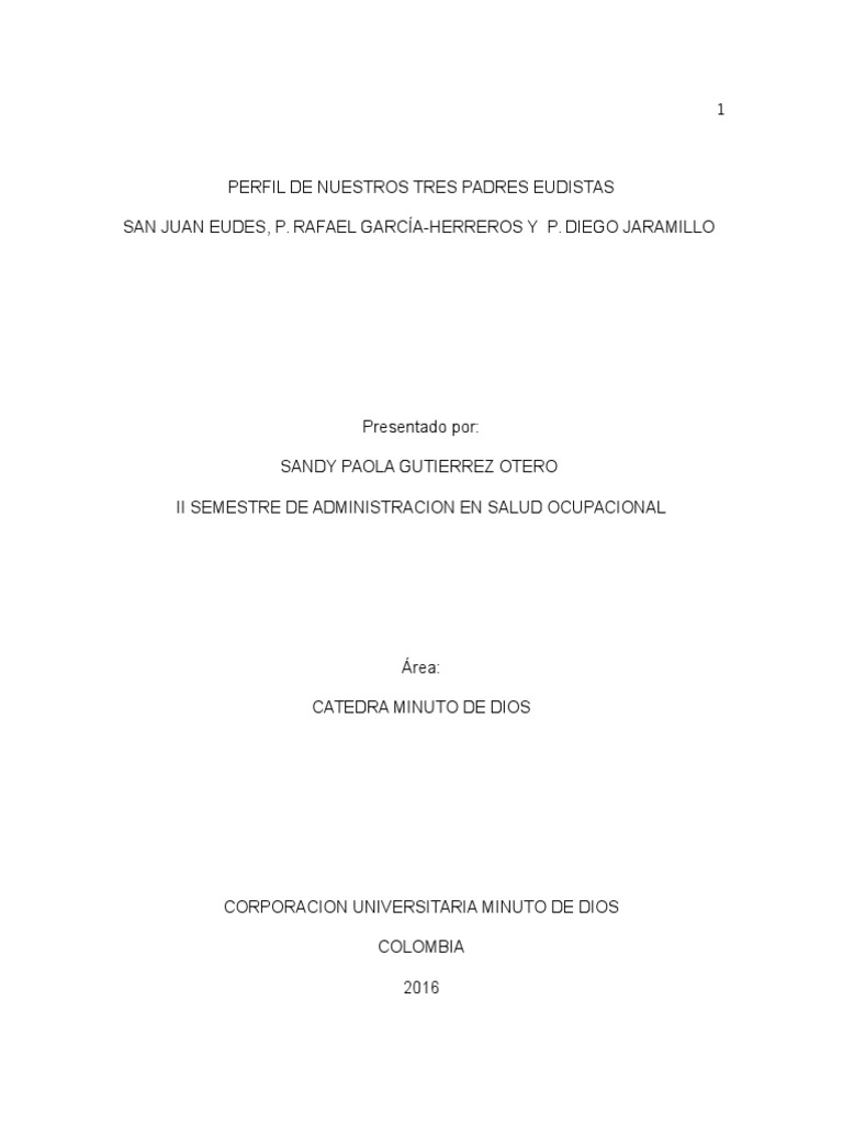 La misión de promover los principios fundamentales que ellos promulgaban e impulsaban siempre en busca de la superación y el mejor estilo se vida de la comunidad. Es allí donde nace la importancia de conocer su origen y formación y deteniéndonos a analizar sus principales fundadores y estos y aportaron y aportan al desarrollo de cada individuo que logra conformar parte de esta ideología. Nombrare a los tres hombres o por mejor así decirlo siervos de Dios que intervinieron y llevaron a cabo esta gran obra y misión logrando gran resultado. Todos en sus épocas aportaron grandes estrategias e ideas que llegaros a formar los primeros pilares para la formación de este gran proyecto. Dejando para todo aquel que llega estar comprometido. Teniendo siempre presente el ejemplo de Jesucristo en esta tierra como creador de este mundo que servía a los más necesitados.2 INTRODUCCION El Eudismo es conocido como un estilo de vida adoptado por aquellos quienes vivifican su vida en este marco espiritual. ellos son: - Juan Eudes Rafael García Herreros Diego Jaramillo Cada uno de ellos reconocidos por su gran trabajo en la obra pero ante todo servidores para todo aquel en busca de ayuda. .