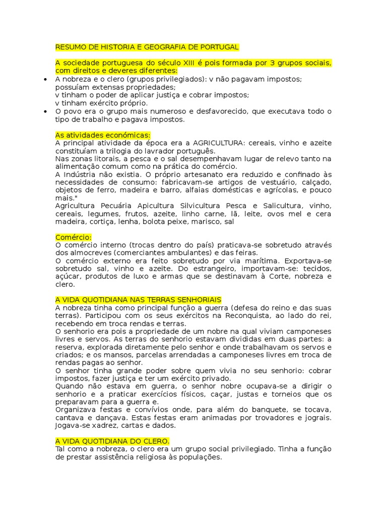 à medida que se iam conquistando terras aos Mouros. de madeira ou pedra. os nossos primeiros reis precisavam de as povoar e fazer cultivar as novas terras. Tal como a nobreza. os monges dedicavam-se ao ensino. Do que produzia. Morava em casas pequenas. legumes. Trabalhavam muitas horas. Símbolo da autonomia do Concelho era o Pelourinho. como renda. O clero dividia-se em dois grupos: o CLERO REGULAR (Composto por frades ou freiras que viviam numa ordem religiosa. toucinho. No mosteiro. e de forma muito dura. A base da alimentação do povo era pouco variada. para além de cumprirem as regras impostas pela Ordem a que pertenciam. Estas casas tinham apenas uma divisão. do forno ou do lagar. Os habitantes dos concelhos. os monges dedicavam-se também ao trabalho agrícola nas terras do mosteiro. chamados vizinhos. Para tal. A maioria dos camponeses vivia nos senhorios. de sol a sol. ovos. a troco de direitos e regalias. Em algumas Ordens. v os mordomos recebiam os impostos. à assistência a doentes e peregrinos. . tinham mais direitos e mais autonomia que os habitantes dos senhorios pois podiam eleger os seus representantes para a administração e a justiça local: v os juízes aplicavam a justiça. tendo combatido contra os Mouros. para atrair povoadores. Os direitos e deveres dos habitantes dos concelhos estavam escritos num documento: a Carta de Foral. geralmente em dias de festa. e outros impostos. à cópia e feitura de livros. em muitos casos. A VIDA QUOTIDIANA DO CAMPONÊS. com chão de terra batida e telhados de colmo. sobretudo a Sul.Tinha grandes propriedades que lhe haviam sido doadas pelo rei ou por particulares e não pagava impostos. Assim nasceram os concelhos. Devia ainda prestar ao senhor outros serviços. exercia a justiça e cobrava impostos a quem vivia nas suas terras. uma grande parte era entregue ao senhor. Vivia em aldeias próximo do castelo do senhor. o rei ou grandes senhores criaram concelhos. Reuniam no Domus Municipalis (casa do município). constituída por pão e o vinho. O seu vestuário era simples feito com tecidos grosseiros. v a assembleia dos homens-bons (os homens mais importantes do concelho) tratavam dos assuntos de interesse geral e elegiam os juízes e mordomos. num mosteiro) e o CLERO SECULAR (bispos e padres) que viviam nas aldeias e nas cidades junto das populações. queijo. Algumas Ordens eram militares. Peixe e carne só muito raramente. OS CONCELHOS. O rei fazia-se representar nos concelhos através do alcaide que era também o chefe militar. como os que devia pela utilização do moinho. Como sabemos. como a reparação das muralhas do castelo.