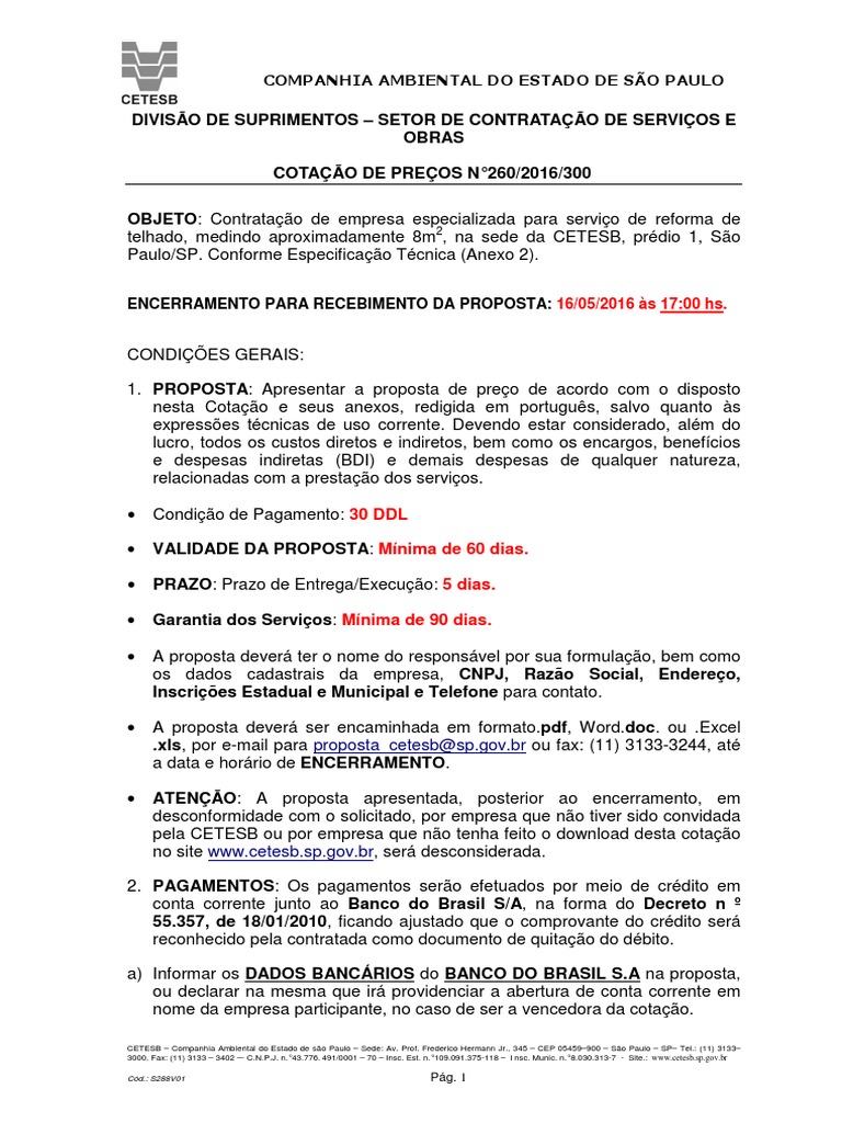 ATENÇÃO: A proposta apresentada, posterior ao encerramento, em desconformidade com o solicitado, por empresa que não tiver sido convidada pela CETESB ou por empresa que não tenha feito o download desta cotação |