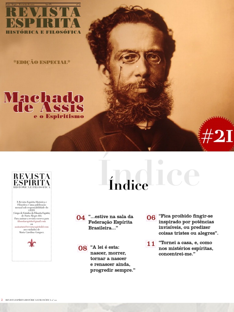 Machado de Assis é, sem dúvida, o grande nome da lite- ratura brasileira. Vivendo no Rio de Janeiro no século XIX (1839-1908), pode acompanhar o processo de desenvolvi- mento do Espiritismo na capital do Brasil. Seus escritos não poderiam deixar de lado a temática es- pírita e a figura do “defunto-autor” Brás Cubas representa a influência que as idéias espíritas tiveram em sua obra. Machado não era espírita, certamente, mas vale a pena conhecer alguns de seus textos que trataram direta ou indi- retamente do assunto. Dedicamos integralmente esse número especial da Revis- ta para trazer uma série de crônicas publicadas na Gazeta de Notícias, do Rio de Janeiro, em que Machado cita o Es- piritismo. Esperamos que estes documentos auxiliem de alguma forma os pesquisadores do Espiritismo. Boa leitura!