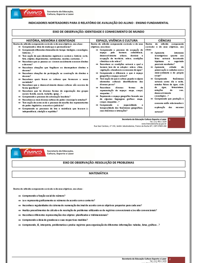 INDICADORES NORTEADORES PARA O RELATRIO DE AVALIAO DO ALUNO - ENSINO FUNDAMENTAL