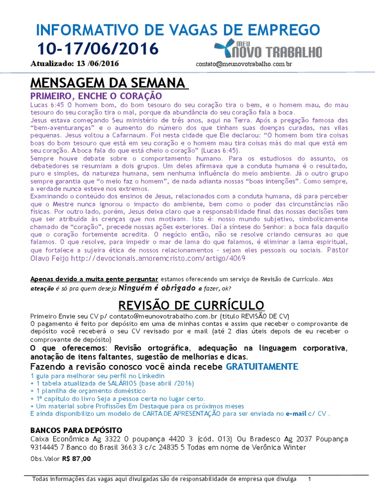 depsito voc receber o seu CV revisado por e mail (at 2 dias teis depois de eu receber o