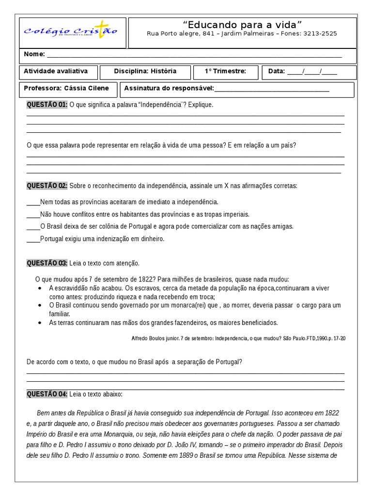 QUESTO 01: O que significa a palavra Independncia? Explique.
