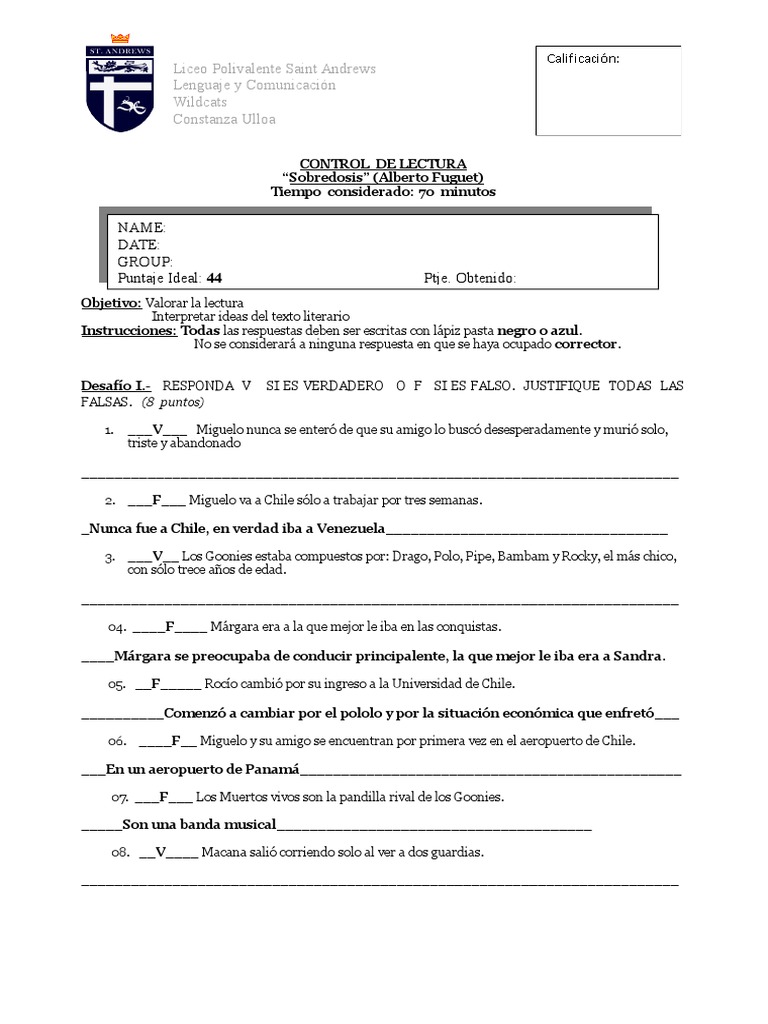 Qué elementos utilizan las amigas en el relato “amor sobre ruedas” para medir sus conquistas y por qué.” Desafío V.COLOQUE EL NÚMERO QUE ESTABLEZCA LA RELACIÓN CORRECTA (12 puntos) 1 Macana 3 2 Márgara 6 3 Drago 2 4 Pipe 1 5 Rocío 4 6 Miguelo 5 Joven capitalino y alcohólico que desea ir al recital de Los Muertos Vivo. También tenían ciertas reglas como: no bajar más allá de Providencia con Lyon y no subir más allá de Tavelli de las Condes y mantenerse siempre en el mismo auto. Que era muy feliz en Estados Unidos Desafío IV. Relate los cambios que presenta Rocío a lo largo del relato. hasta se decían que eran del frente. posee personalidad extraña y trabajólica.. pasó a ser “intelectualoide” y a hablar de cosas políticas alabando a Pinochet. (8 puntos) . (10 puntos) 1. “se pasó al gaviota por la raja. Amigo del narrador. que las invitaran a tomarse unas bebidas y continuando así con el intercambio de número telefónico y a lo más llegaban a un mirador pero evitando tener un contacto mayor. ser tiernos. le dio un beso con lengua a la vieja y la quinta se vino abajo y el grupo entero tuvo que pasar a la clandestinidad. Joven de clase alta que entró a la Universidad.VOCABULARIO: explique con sus palabras las siguientes jergas juveniles que usaban los personajes. Dé ejemplos del texto (3 puntos) Cuando al Rocío se puso a pololear con Juan Luis. Que le había mentido sobre su vida exitosa. Durante el festival de Viña..Liceo Polivalente Saint Andrews Lenguaje y Comunicación Wildcats Constanza Ulloa d. Redacte una oración en cada caso. Joven de 13 años que acaba de matar a Yoko Joven que también va a Recital de Los Muertos Vivos. 2. 3. DESARROLLE LAS SIGUIENTES PREGUNTAS. Desafío III. también era más “cartucha” Cuando la empresa del papá se fue a quiebra ella renegó su pasado ABC1 y comenzó a frecuentar lugares “lanas e izquierdistas” y a salir con un tipo “barbudo y de cotelé”. tiene un temperamento fuerte cuando la desafían. no muy inteligentes (ya que los imbéciles eran los mejores). e. Dé ejemplos del texto (3 puntos) Ciertamente los hombres que ellas buscaban debían tener menos de 30 años. ¿Por qué el grupo los muertos vivos resulta ser un grupo contestatario y cuál sería la implicancia política? De ejemplos. Joven que conduce un auto. Tímido y drogadicto. (4 puntos) Era un grupo musical en contra de Pinochet.