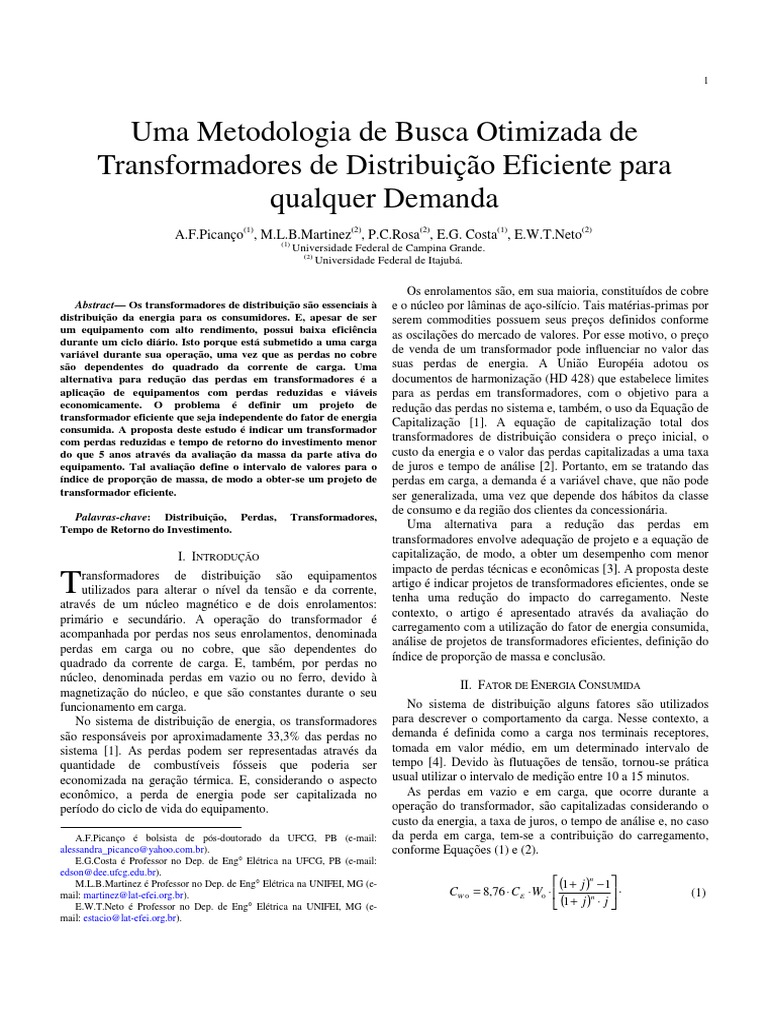 Economical Analysis and Technical Solutions for Efficient Distribution Transformers”, MedPower 2008, 6 th Mediterranean Conference and Exhibition on Power Generation, Transmission, Distribution and Energy Conversion, Thessaloniki, Greece, November, 2008; N. Kagan, C.C.B. de Oliveira, E.J. Robba, “Introdução aos Sistemas de |