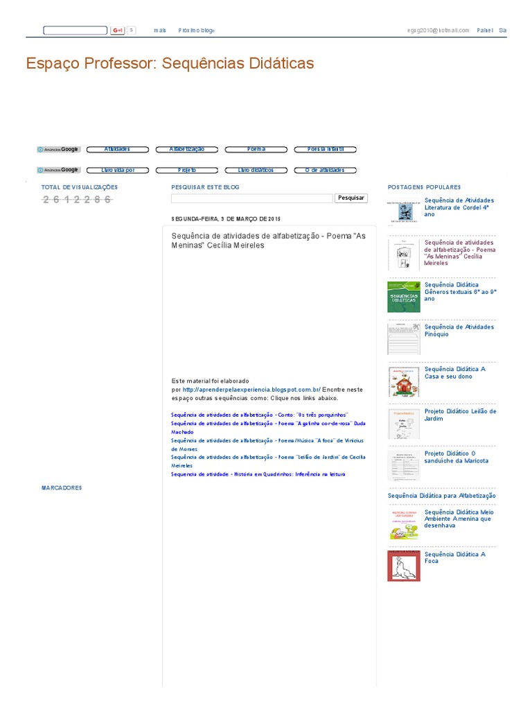 Sequência de atividades de alfabetização - Conto: "Os três porquinhos" Sequência de atividades de alfabetização - Poema "A galinha cor-de-rosa" Duda Machado Sequência de atividades de alfabetização - Poema/Música "A foca" de Vinícius de Moraes Sequência de atividades de alfabetização - Poema "Leilão de Jardim" de Cecília Meireles Sequencia de atividade - História em Quadrinhos: Inferência na leitura