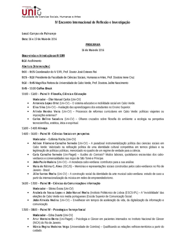 Stephanie de Jesus (Université Bordeaux Montaigne) – Voltar à terra: A ecologia na construção ficcional do romance Ilhéu de Contenda de Henrique Teixeira de Sousa. Aguinaldo José Gonçalves (Universidade Fernando Pessoa) – Singularidade e Pluralidade: Investigações acerca da literatura africana. competências e atitudes linguísticas da diáspora cabo-verdiana em Madrid. Isabel Ponce de Leão (Universidade Fernando Pessoa) – A saga do busto de Camões em Paris (1912-2012). Elvira Gomes dos Reis (Uni-CV) – A importância da educação linguística na internacionalização das competências.Faculdade de Ciencias Sociais. Cláudia Sofia Beato (UBI/CITAD-FCT/Uni-CV-CIDLOT) – Globalização. Szymaniak (Uni-Piaget) – Memória da Aéropostale na Ilha de Santiago. Sílvia Rodilla Rivas (Uni-CV) – Práticas. espaços de lazer. recreio e cultura: reflexões sobre a Cidade da Praia. Paulo Osório (Universidade da Beira Interior) – Elementos para uma periodização da história da língua portuguesa. Recursos Naturais e Urbanismo Moderador – Clementina Furtado (Uni-CV) Vladmir Silves Ferreira (Uni-CV) – A construção de barragens como veículo de promoção da agricultura irrigada: dinâmicas e desafios agro-fundiários. Pedro Borges Graça (ISCSP-Universidade de Lisboa) – A Plataforma Continental Marítima de Portugal: Desafios e Respostas. 16:00 – 18:00 – Painel VIII – Ambiente. 13:15 – 14:00 Almoço 14:00 – 16:00 – Painel VII – História e Relações Internacionais Moderador – Maria de Fátima Fernandes (Uni-CV) Ablam Benjamin Akoutou (Instituto da África Ocidental) – Histoire de L´Afrique: une perspective différente de ce qu’on nous enseigne dans les cours d´histoire. 18:00 – Sessão de encerramento . Wlodzimierz J. Gildaris Ferreira Pandim (Uni-CV/Leitora Rede Brasil Cultural) – Uso de conceitos da terminologia no ensino do português. Mara de Castro Abu-Raya (Uni-CV) – Avaliação da contaminação por metais em gastrópodes. Tânia Sofia Ribeiro Libório (Universidade de Évora) – O impacte dos projectos da AMI nos PALOP: caso específico de Cabo Verde. Luís Paulo de Almeida (IESM-Universidade Nova de Lisboa) – O modelo de análise estratégica da OTAN aplicado à sociedade civil: o caso do Comprehensive Operations Planning Directive. Strombus Latus. Cabo Verde. Arminda de Santa-Cruz Brito (Uni-CV) – A arte do bem marear em Henrique Teixeira de Sousa. Humanas e Artes 18:00 – Apresentação das Atas do III EIRI – Arlindo Barreto (Uni-CV) / Manuel Brito-Semedo (Uni-CV) 27 de Maio de 2016 09:00 – 11:00 – Painel V – Literaturas em viagem Moderador – Mariana Faria (Uni-CV) Olavo Bilac Cardoso (Uni-CV) – William Shakespeare: uma voz que ainda tem muito por nos dizer. da Baía do Porto Grande da Ilha de São Vicente. Ana Mafalda Rodrigues (Universidade de Coimbra) e Celestino Barbosa (Uni-CV/CMP-Gabinete de Proteção Civil) – Riscos e cartografia no planeamento urbano e gestão de emergência na cidade da Praia: o caso do bairro Safende. 11:00 – 11:15 Coffee Break 11:15 – 13:15 – Painel VI – Diversidade(s) linguística(s) Moderador – Elvira Reis (Uni-CV) Lucia López Vázquez (Uni-CV) – La variación pragmática en el aprendizaje-enseñanza de las lenguas policéntricas.
