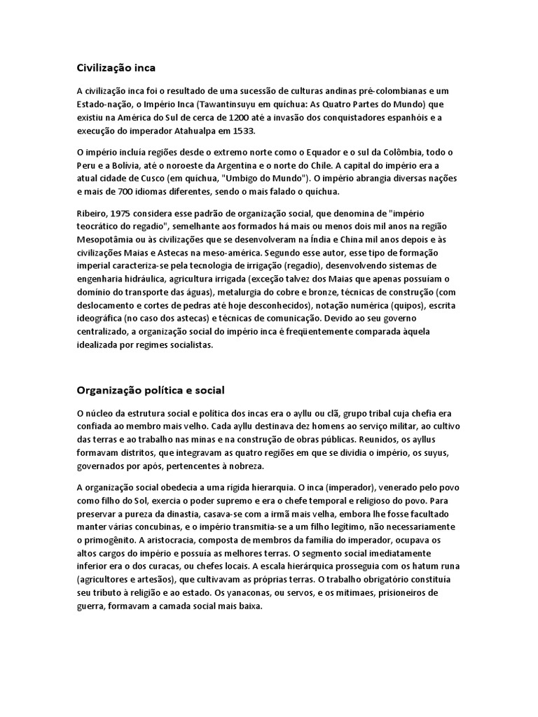altos cargos do império e possuía as melhores terras. O segmento social imediatamente inferior era o dos curacas, ou chefes locais. A escala hierárquica prosseguia com os hatum runa (agricultores e artesãos), que cultivavam as próprias terras. O trabalho obrigatório constituía